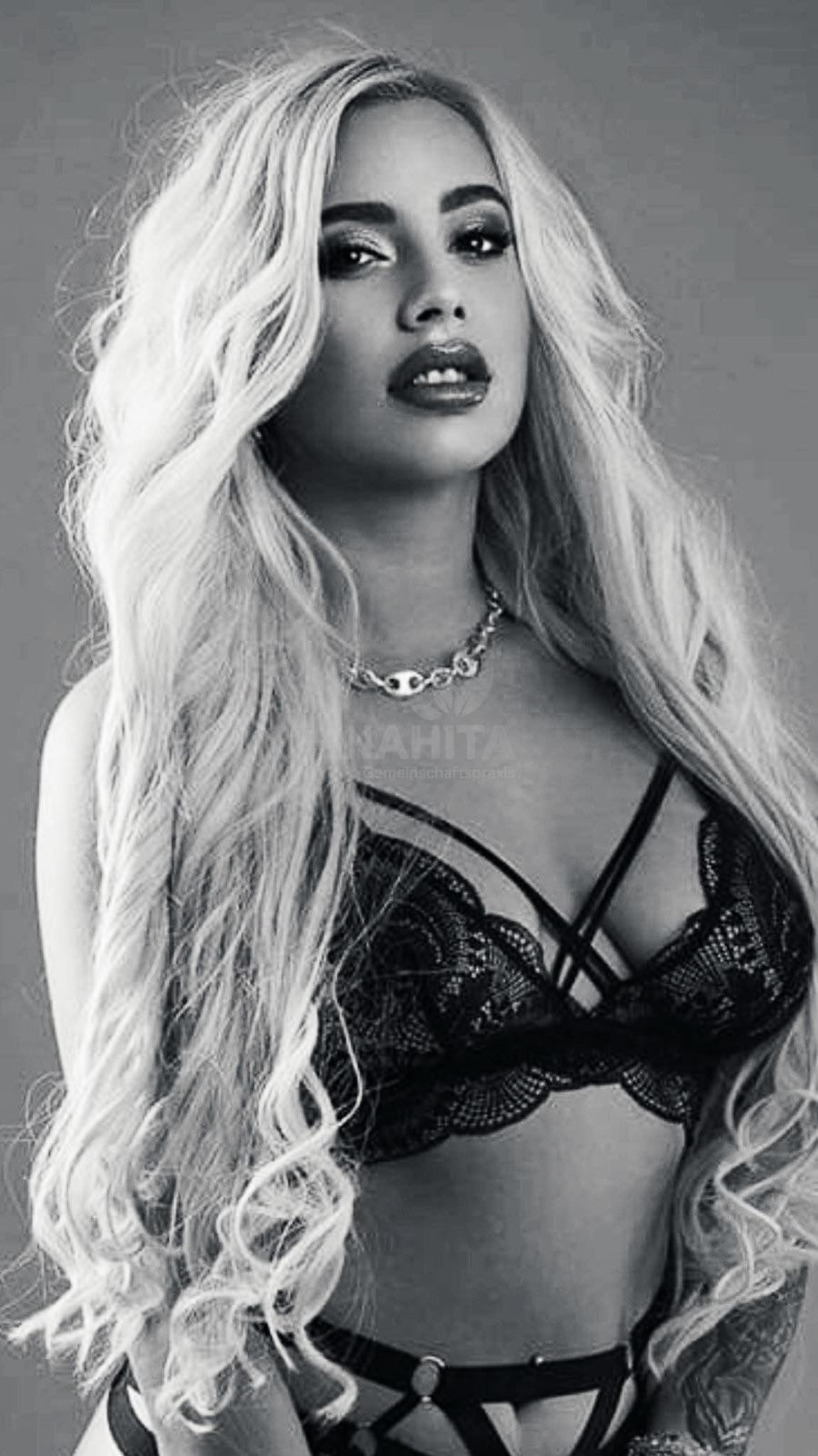Ihr langes, hellblondes Haar fliesst weich über ihre Schultern und unterstreicht ihre zarte, feminine Ausstrahlung. Grosse, ausdrucksstarke Augen verleihen ihr eine besondere Tiefe, während ihr sinnlicher Mund mit seiner weichen Form sofort ins Auge fällt. Ihr gesamtes Erscheinungsbild wirkt harmonisch, anschmiegsam und voller Wärme – eine Frau, die man nicht nur sieht, sondern spürt.